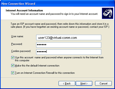 Internet Account Information screen will appear.